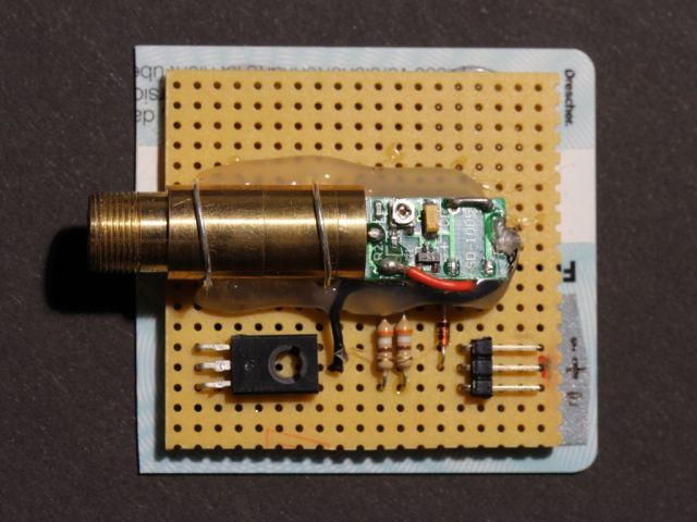 Then I went to the basement to solder the whole thing. My lesson in dealing with green laser modules: if they are round they can roll of the bench, hit the concrete floor and break. This is what the module did 😦 Fortunately I was able to fix this with generous use of hot glue. See the final result below.