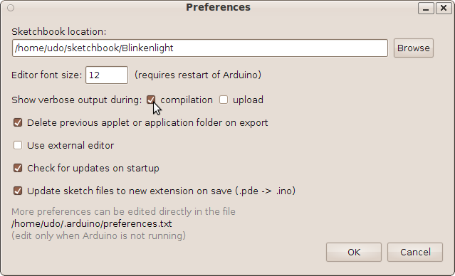 In order to figure out the cause for the overhead we will disassemble the compiled sketch. To prepare for this we will switch the IDE to “verbose” mode.