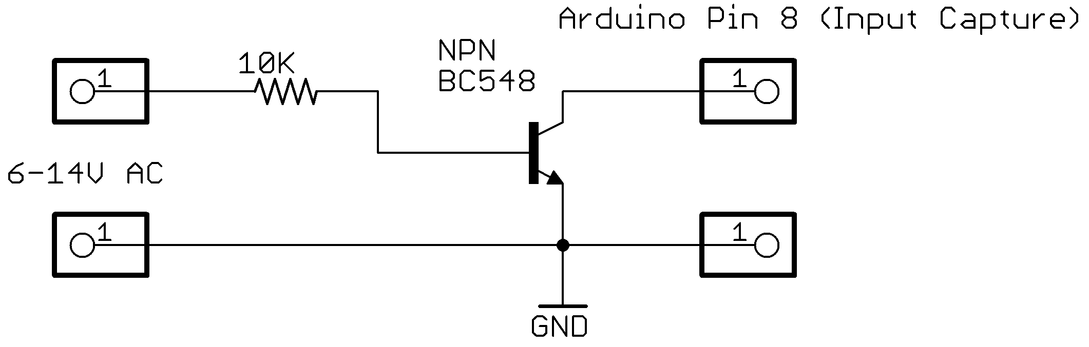 I use the same circuit as in the first experiment to decouple the Arduino from the power grid. But this time the pulses are fed into pin 8 (=input capture). That is I want to trigger the “input capture interrupt” whenever a pulse is detected. “Input capture” means that the processor will capture the exact value of the 16-bit hardware timer 1 in the “input capture register”. Thus the value will not depend on how fast my code reacts to interrupt (as long as it is fast enough to deal with the capture before the next interrupt is triggered).
